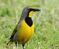 Довжина птаха становить 22-23 см. Верхня частина тіла оливково-зелена, хвіст чорний, на кінці жовтий. Голова і шия сірі, над очима жовті "брови". Нижня частина тіла жовта, на грудях широкий "комірець", кінці якого ідуть по шиї до очей і далі до дзьоба. Лапи сизі, дзьоб чорний. Виду не притаманний статевий диморфізм. У молодих птахів нижня частина тіла тьмяно-сіро-зелена, "комірець" відсутній.
