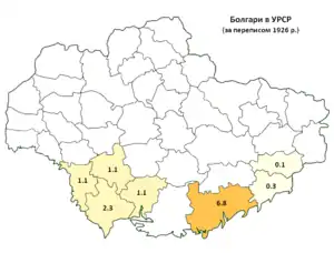 Болгари проживали переважно компактно, в 40 чисто болгарських сільрадах було зосереджено 76 % всіх українських болгар. 72,5 % болгарських дітей вчилися в болгарських школах. Після 1933-го року болгарські райони було ліквідовано.