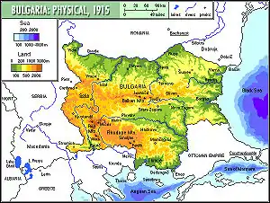 Понад 2/3 території країни займають низовини, рівнини і височини (до 600 м). Середні абсолютні висоти близько 470 м. Більшу частину країни займають гірські хребти Стара-Планина, Средна-Гора, Рила з горою Мусала (висота 2925 м — найвища точка Балканського п-ва), Пирин, Родопи. На півночі — Нижньодунайська рівнина, в центрі — Казанликська котловина. Південніше — велика Верхньофракійська низовина. Клімат помірний, на півдні перехідний до середземноморського. Річки: Дунай, Мариця.