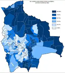 В країні 3 державні мови — іспанська, кечуа та аймара. В цілому іспанською володіють 77 % населення, та доля ця постійно зростає. Болівійська іспанська сильно відрізняється від іспанської, яку знають в інших країнах Латинської Америки, оскільки містить велику кількість індіанських слів та висловів. Більшість іспаномовних болівійців є двомовними, вони знають іспанську та одну з індіанських мов — кечуа, аймара чи гуарані. Індіанці також між собою спілкуються рідною мовою, у містах же розмовляють іспанською. Разом у Болівії 39 % населення є двомовними, й 3 % — тримовними.