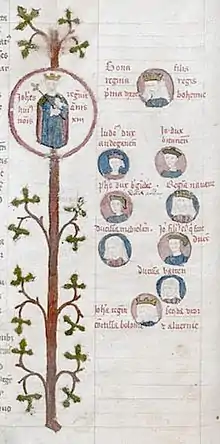 Онука імператора Священної Римської імперії Генріха VII, старша сестра богемського принца Вацлава, який став згодом, уже після її смерті, імператором Священної Римської імперії Карлом IV.
