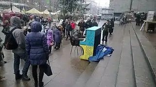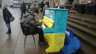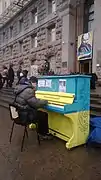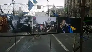 Київ, Хрещатик, Євромайдан 2014. На фото 28 січня та 9 лютого Андрій Бондаренко перед Київрадою грає твори Шопена, Рахманінова. З початку лютого поперек Хрещатику від Будинку профспілок знаходилася галерея вибраних фотографій Майдану. На фото 16 лютого фрагмент цієї галереї (Святослав Вакарчук, Андрій Бондаренко та інші). Усе це було знищене Беркутом під час наступу 18 лютого.