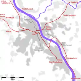 - Лінії 16 та 18 — пов'язують Бонн з Кельном, спільно використовуються з системою кельнського шдадтбану, створюючи міжміські лінії. На цих лініях курсують потяги обох мереж. Довжина лінії 16 становить 45,6 км, з яких 13,6 км в Бонні, лінії 18 становить 48,4 км, з яких 4,8 км в Бонні.