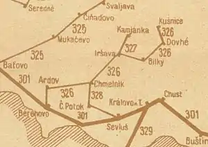- 327 Іршава — Кам'янка. Залізниця вела до підніжжя Великого Ділу між Бужорою (1086 м н.р.м.) та Синяком (1040 м н.р.м.). Рух здійснювали 3 пари змішаних потягів, а від червня 1923 року — 2 пари. Час їзди в одному напрямку — 60 хвилин.