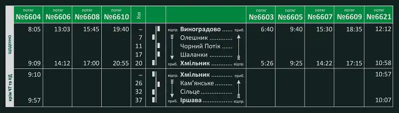 - 84 Виноградів — Хмільник. Рух здійснювали: 3 пари змішаних потягів Виноградів — Хмільник[12].