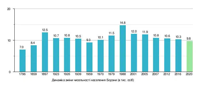 Брокгауз і Єфрон описують Борзну на початку XX століття: «У місті Борзна 8582 жителів, будинків 1569, церков православних 4. Місто дуже бідне: магазинів 10, крамниць 70, кам'яних будинків 2; маслоробні і шкіряні заводи; розведення тютюну; міської землі 720 десятин. Число осіб, що володіють нерухомим майном — 1248. Міські доходи 1750 рублів. Приміські села Кінешевка і Часниківка мають 1267 чол. жителів, які приєднані до міського. Незважаючи на значну старовину і зручне положення, місто Борзна не розвивається ні в промислово-заводському або торговому відношенні, ні щодо зростання населення»[17].