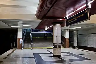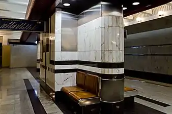 У вестибюлях — глянсова рейкова стеля темно-коричневого кольору, яка на платформі трансформується у центральний карнизний елемент.