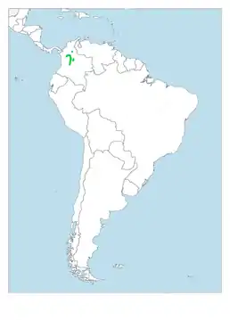 Ендемік Колумбії. Трапляється у гірських хмарних лісах на західних схилах Анд на південному сході департаменту Антіокія та півночі Кальдасу.
