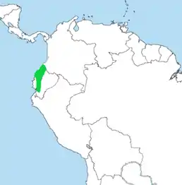 Вид поширений на південному заході Колумбії та заході Еквадору. Мешкає у тропічних низовинних вологих лісах та вторинних лісах вздовж тихоокеанського узбережжя до 1300 м над рівнем моря.