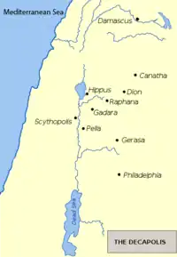 По узбережжю Середземного моря тягнувся ланцюжок еллінізованих міст – Газа, Аскалон, Азот (колишні міста філістімлян), Ямнія, Іоппія, Аполлонія, Стратонова Вежа, Дор (колишнє місто чекерів), Птолемаїда. На західному березі Йордану розташовувався Скіфополіс, а у Зайорданні на території колишнього Галааду еллінізували міста Пела, Гадара, Абіла та Гераса. Північніше від них на східному березі Генісаретського озера (територія колишньої країни Гашур) з’явився Гіппос, а південніше столиця стародавнього Аммону (котрий час-від-часу потрапляв у залежність від ізраїльських царів) Раббат-Аммон перетворилась на елліністичну Філадельфію.