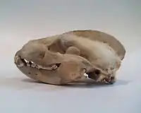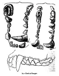- у мандибулі — 3 різці, 1 ікло, 4 премоляри (перший, заікловий — дуже малий) та 2 моляри (з них перший — дуже великий). Про одні з найбільших зубів див. Хижі зуби — 4-й верхній премоляр (останній передкутній, pM4) та перший нижній моляр (перший кутній, M1).); разом 3+1+4+2 = 10х2 = 20 зубів.