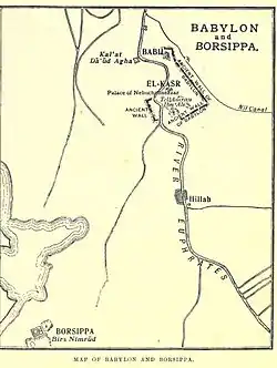 Борсіппа, Барсіппа (шум. Ba-ad-DUR-si-a-ab-ba або Badursiabba («Ріг моря»), 1) аккад. Barzipa, 2) Tintir IIkum‑KI («Другий Вавилон»), 3) Kinnir, Kinunir («Місце боротьби»), сьогоднішній Бірс-Німруд, у честь міфічного царя Німрода, — важливе давнє місто Шумеру і Вавилонії, відоме з часів III-ї династії Уру. Місто розташоване за 20 км від Вавилону і лежить поблизу великого озера, яке тоді називалося «морем» (тамту, tamtu), котре лежало на північний захід від міста. На напрямі березі озера була намивна ділянка суходолу, яка називалася рогом. Борсіппа розташовувалась безпосередньо на цьому розі.