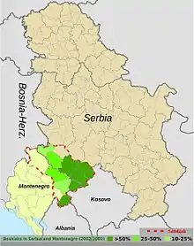 Рожає (община) (88,46 %) Петніца (община) (95,61%) Плав (община) (57,45 %) Гусинє (община) (52,05) Бієло-Полє (община) (53 %) Беране (община) (46 %) Плєвля (община) (37 %) |
