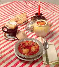 | Необхідні компоненти | М'ясо (яловичина, баранина), овочі (капуста, картопля, помідори, морква), петрушка, часник, перець чорний |