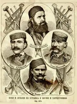 ![]() Ілюстрація з героями повстання 1876 року видавництва Orao, сербського щорічного видання, опублікованого в Новому Саді Ілюстрація з героями повстання 1876 року видавництва Orao, сербського щорічного видання, опублікованого в Новому Саді | |||||||