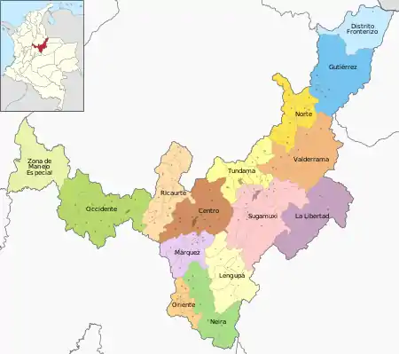 Департамент Бояка складається з 13 провінцій та 2-ох спеціальних округи, які поділяються на 123 муніципалітети: