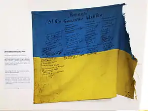 ![]() Прапор опорного пункту «Вінець», під яким бійці виконували бойові завдання з утримання Бахмутської траси Прапор опорного пункту «Вінець», під яким бійці виконували бойові завдання з утримання Бахмутської траси | |||||||