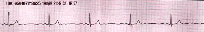 При відсутності електричного імпульсу від синусового вузла до атріовентрикулярного вузла розвивається атріовентрикулярна вузлова брадикардія. На ЕКГ виражається нормальним комплексом QRS, що супроводжується інвертованою Р-хвилею перед, під час або після комплексу QRS.