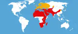Вид поширений в Африці, Південній Європі, Західній та Центральній Азії, Індії, Китаю. Влітку бродяжні особини трапляються по всій Європі, в Сибіру та Японії.