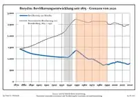 Динаміка населення з 1875 року в сучасних кордонах (Синя лінія: населення; Пунктир: відносна порівняльна динаміка населення землі Бранденбург; Сірий фон: період Третього рейху; Помаранчевий фон: період НДР)