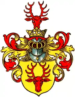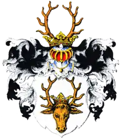 У срібному щиті коронована голова оленя натурального кольору, з рогами. Намет чорний підбитий сріблом. У клейноді оленячі роги.