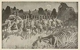 Це я Ракша (Сатана), відповідаю тобі! Людське дитинча моє! Чуєш ти Кульгавий!- тільки моє! І його не вб'ють! Воно житиме й бігатиме в нашій Зграї, полюватиме разом з нами..... воно ще полюватиме на тебе! |