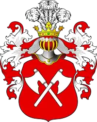 На червоному полі дві сокири, рукоятки яких схрещені, а вістря обернені — одне ліворуч, а інше праворучи. В клейноді три страусині пера.