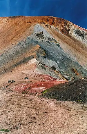 Назва походить від жовтих плям сірки на його поверхні. Однак поверхня вулкана є різноманіттям кольорів: тут і зелений (мохи), рожевий (осади заліза), бежевий (ріоліт), сірий, синій та чорний (базальт, ретініт та відкладення попелу), білий (вапнякові осади). Через це фотографії вулкана часто фігурують у матеріалах природоохоронної території Ландманналойгар, розташованої неподалік, книгах та календарях.