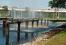 Бризкальна установка складається з басейну глибиною 1 — 1,5 м, циркуляційного насоса і системи розбризкувальних сопел.