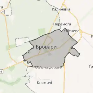Місто Бровари знаходиться на півночі України, на заході межує з Києвом, на півночі з Києвом і селом Калинівка, на сході з селами: Перемога, Квітневе і Красилівка, на півдні — Княжичами і Требуховом.