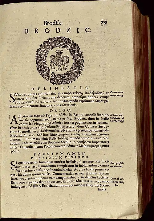 Сторінка із гербовника С. Окольского «Orbis Poloni» (1642, Краків) с описом герба Бродич