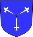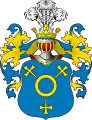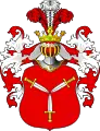 В червоному (іноді блакитному) полі три золоті хрести, що виходять із золотого кільця, два до верхніх кутів щита, а третій прямо вниз. На шоломі п'ять страусиних пір'їн.