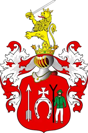 На червоному полі срібна підкова, шипами обернена донизу; на її вершині срібний хрест; праворуч від неї стріла, що летить угору, а ліворуч чоловік у мисливському одязі тримає спорядження схоже на вила, які використовують мисливці.