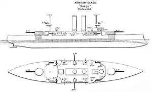 Озброєння — артилерія: 2 × 210-мм / 44, 6 × 150-мм / 46, 8 × 76-мм, 4 × 47-мм; торпедне озброєння: 2 × 457-мм торпедні апарати.