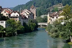 У Альтенбурга підводний канал електростанції Вільдегг-Бругг з'єднується зі старим руслом Ааре на північ від лісового масиву «Шахенінзель», який запружений допоміжною греблею. Після вигину навколо скелі Альтенбург Ааре тече в східному напрямку через 200-метрову ущелину з порогами, де стоїть колишня міська електростанція і де Зюссбах впадає в Ааре. Річка, ширина якої в інших випадках досягає 130 м, проходить поруч зі старим містом Бруґґ через глибокий пролом у вапняковій скелі шириною всього 12 м, через який в найвужчому місці перекинутий старий міст[4].