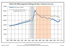 Динаміка населення з 1875 року в сучасних кордонах (Синя лінія: населення; Пунктир: відносна порівняльна динаміка населення землі Бранденбург; Сірий фон: період Третього рейху; Помаранчевий фон: період НДР)