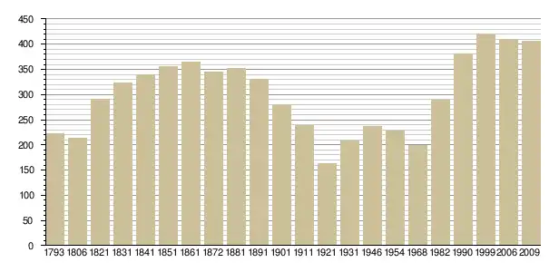 Динаміка населення (base Cassini de l'EHESS pour les nombres retenus jusque 1962[3], base Insee à partir de 1968 (population sans doubles comptes puis population municipale à partir de 2006)[4] · [5] ):