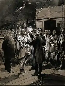 ![]() Лікар проводить обстеження матроса задля виявлення можливих бубонів, як ознак відповідної форми чуми Лікар проводить обстеження матроса задля виявлення можливих бубонів, як ознак відповідної форми чуми | |