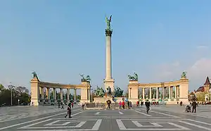 У центрі площі Героїв розташований пам'ятник Тисячоріччю Угорщини. Його побудували в 1896 р. до свята, але на початку ХХІ ст. змінили деякі його скульптури. Центр ансамблю становить 36-метрова колона з крилатим генієм на вершині та статуї вождів семи угорських племен, серед них і Арпада, вождя угорців, що прийшли у 896 р. на територію нинішньої Угорщини. По обидва боки колони — напівкругла колонада з бронзовими статуями видатних діячів угорської історії.
