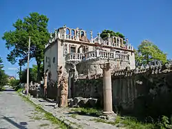 Обнесений будинок камінною огорожею, зовні якої також розташовано низку скульптур. Головна з них — скульптура Мадонни з немовлям, яка стоїть на самому березі Стиру[7].