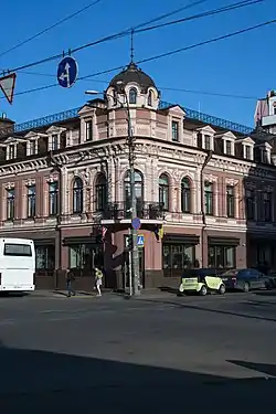 Двоповерховий цегляний будинок з підвалом, фасад прикрашений маскаронами із жіночих облич. Тому в народі звався будинком «з янголами». На першому поверсі будинку розміщались торгівельні приміщення, а житлові — на другому.[2][3]