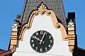 Багатоярусний дах будинку, оздоблений червоною черепицею, вінчали 5 веж. Купол центральної з них виконаний у характерній для українського бароко грушеподібній формі. Цю ж вежу було прикрашено великим (1,8×1,8 метрів) хрестоподібним флюгером з зображенням списового двобою козака зі шляхтичем[7]. Флюгери на малих вежах були виконані у формі сонця з уписаними силуетами коня, сокола, орла, сагайдака — козацькими геральдичними символами.