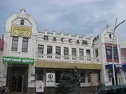 Будинок являє собою витягнутий прямокутник з 2-ма виступаючими бічними еркерами (південний мав наскрізний арочний проїзд у внутрішній двір) і балконом між ними (спершу в спрощеному вигляді існував з дворової сторони також), що був фасадом цілого комплексу будівель в еклектичному стилі, який включав окремо кухню, каретну, підсобні приміщення тощо. В ході реконструкції 1990-х дворову частину зайняла прибудова нового корпусу з 2-поверховим торговим залом з одностороннім розташуванням павільйонів, перекритим циліндричним світловим ліхтарем в центральній частині.