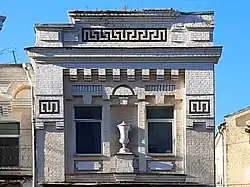 Фасад оздоблено ажурними кованими огорожами балконів, парапету й ліпними деталями. Будинок фланкований ризалітами, які увінчані прямокутними аттиками з меандровим фризом.