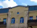 Має плаский ризаліт, який увінчує щипець з трикутним завершенням, барельєфною композиція і круглим горищним вікном. Кругле вікно обрамляє гірлянда з квітів, по боках — факели зі стрічками та дві алегоричні фігури. Має орнаментальні розетки під вікнами п'ятого поверху (квітки з жіночими голівками в центрі), сандрики над вікнами третього поверху, барельєфна ваза між вікнами шостого поверху ризаліту. Фільонки вікон шостого поверху містять композиції з зображеннями двох амурів, які тримають лавровий вінок. Під вікнами четвертого поверху розміщені картуші.[1]