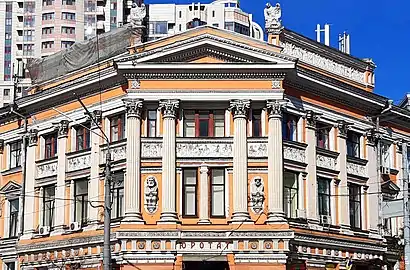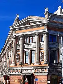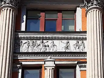 Будівлю завершує антаблемент з іонічним фризом. Карниз спирається на кронштейни з орнаментальними деталями. Уздовж розміщені розетки, іоніки та зубці. Доричний фриз зі стрічками іоніків і меандровим орнаментом проходить також над першим поверхом. Між метопами фриза містяться квіткові розетки.