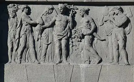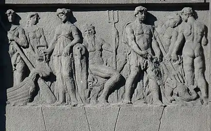 Між пілястрами над четвертим поверхом розміщено три барельєфні композиції. На лівій зображений давньогрецький бог Гефест-коваль. На середній — бог-заступник торгівлі Гермес із чарівним жезлом кадуцеєм, жінки з рогом достатку, серпом й амфорами. На правій — один з наймогутніших богів, володар океану Посейдон із тризубцем, а також жінки, рибалки, човен.