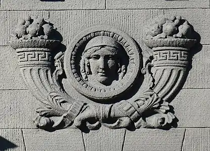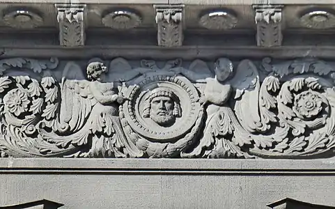 У медальйонах на фронтоні вміщено лев'ячі маскарони.