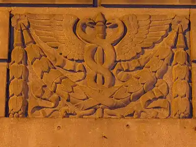 Чоловий фасад має вертикальну композицію і розділений на три яруси. Нижній ярус — перший і другий поверхи, які підкреслено рустом й арковими прорізами по боках. Над входами зображення кадуцея. Середній оздоблений на рівні третього–п'ятого поверхів пілястрами коринфського ордера. Верхній — відокремлений карнизом аттиковий шостий поверх із фронтоном[1].