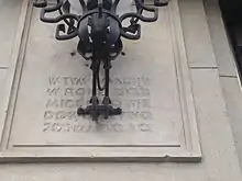 Також на фасаді будинку за настінним ліхтарем, можна розгледіти майже повністю затерту меморіальну таблицю з написом польською мовою, який українською читається як:
